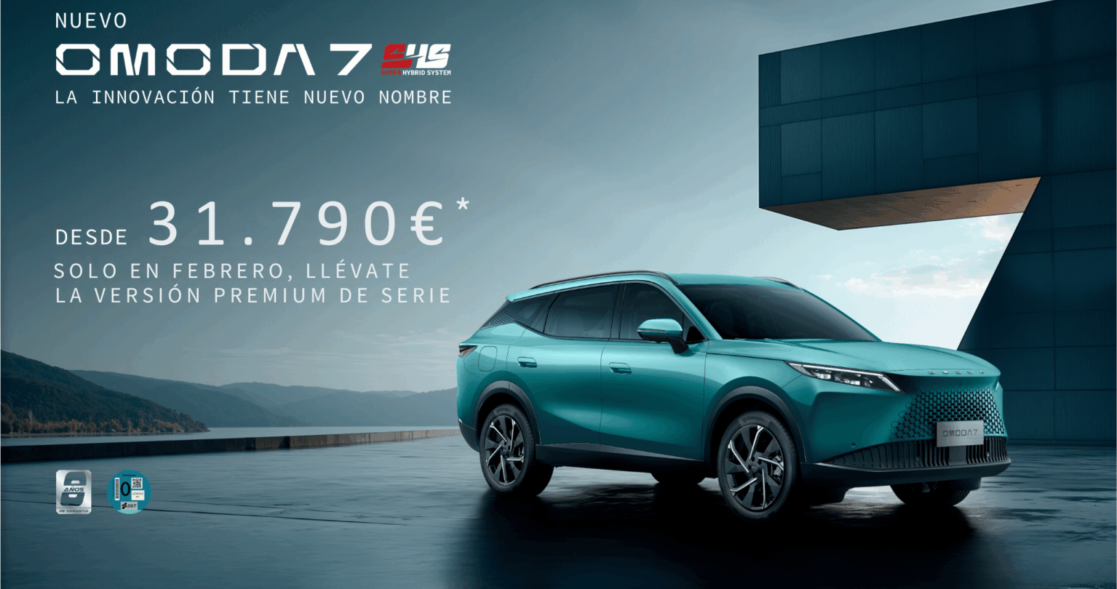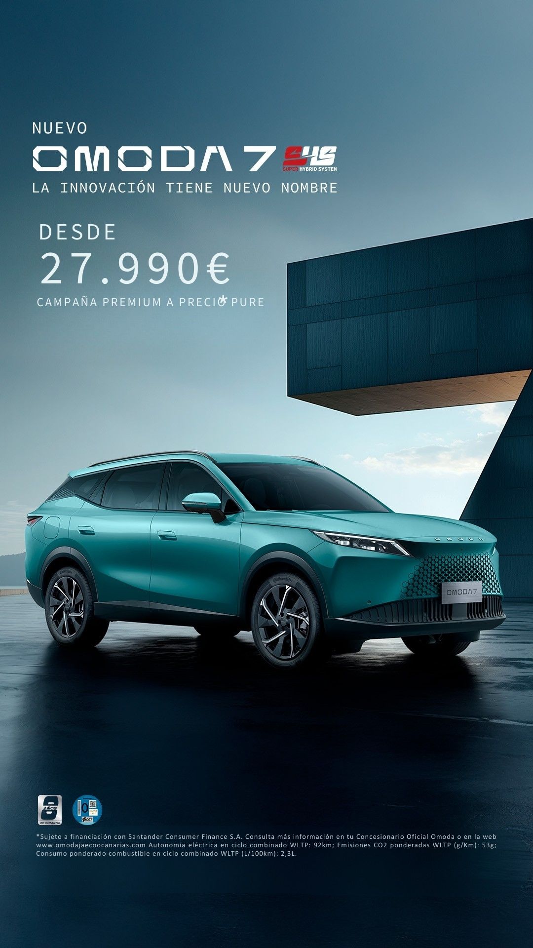 *PVP recomendado en Canarias para OMODA 7 SHS 1.5TGDi 205 kW (279cv) (IGIC, impuestos de matriculación, transporte, descuento de marca y concesionario, descuento por permuta y descuento por financiar con Santander Consumer Finance S.A., incluidos en la oferta). Sistema de amortización Francés. Promoción puntual de oferta de versión Premium a precio de versión Pure. Oferta válida para clientes particulares que financien a través de Santander Consumer Finance, S.A. sujeta a estudio y aprobación según condiciones actuales con un capital mínimo de 18.000€, y con una duración y permanencia mínima de la financiación de 36 meses. Campaña incompatible con otras ofertas financieras. Oferta válida hasta el 31/03/2026 y sujeta a disponibilidad de stock. Garantía comercial de 8 años o 160.000 km (lo que ocurra primero), según Manual de Garantías. No incluye gastos de matriculación y pre-entrega. Autonomía eléctrica en ciclo combinado WLTP: 92km; Emisiones CO2 ponderadas WLTP (gr/Km): 53; Consumo ponderado WLTP (l/100 km): 2,3. Para más información consulta en tu Concesionario Oficial OMODA.
