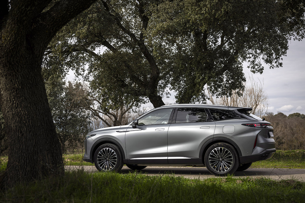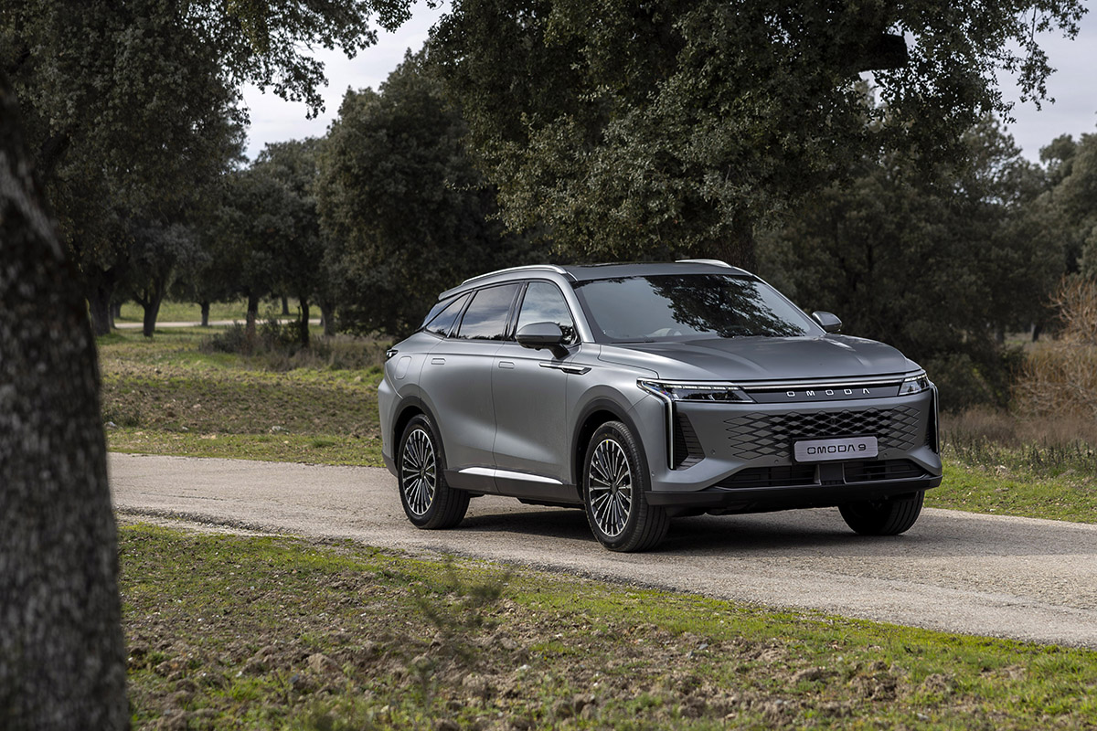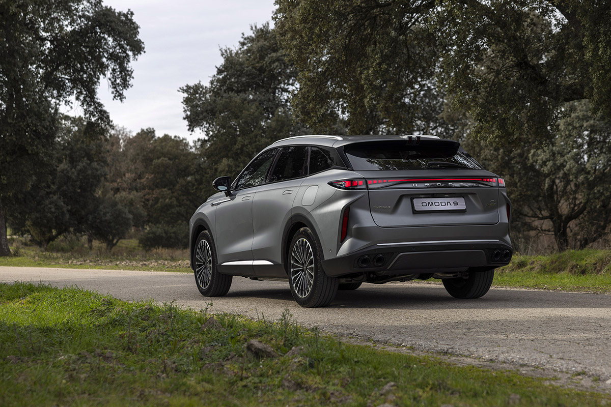 El Omoda 9 SHS es el modelo más grande y sofisticado de Omoda & Jaecoo. Con 4,77 metros de largo, 1,92 de ancho y 1,67 de alto, este SUV de gran tamaño combina elegancia, diseño deportivo y sostenibilidad, marcando un nuevo estándar en el segmento D-SUV. Su carrocería tipo cross-coupé, las llantas de aleación de 20 pulgadas y los tiradores retráctiles le otorgan una presencia poderosa, mientras que la firma lumínica con tecnología LED envolvente refuerza su carácter moderno y tecnológico. Además, puede presumir de una afinada aerodinámica (Cd: 0,308) con la que obtiene un gasto muy reducido de combustible.